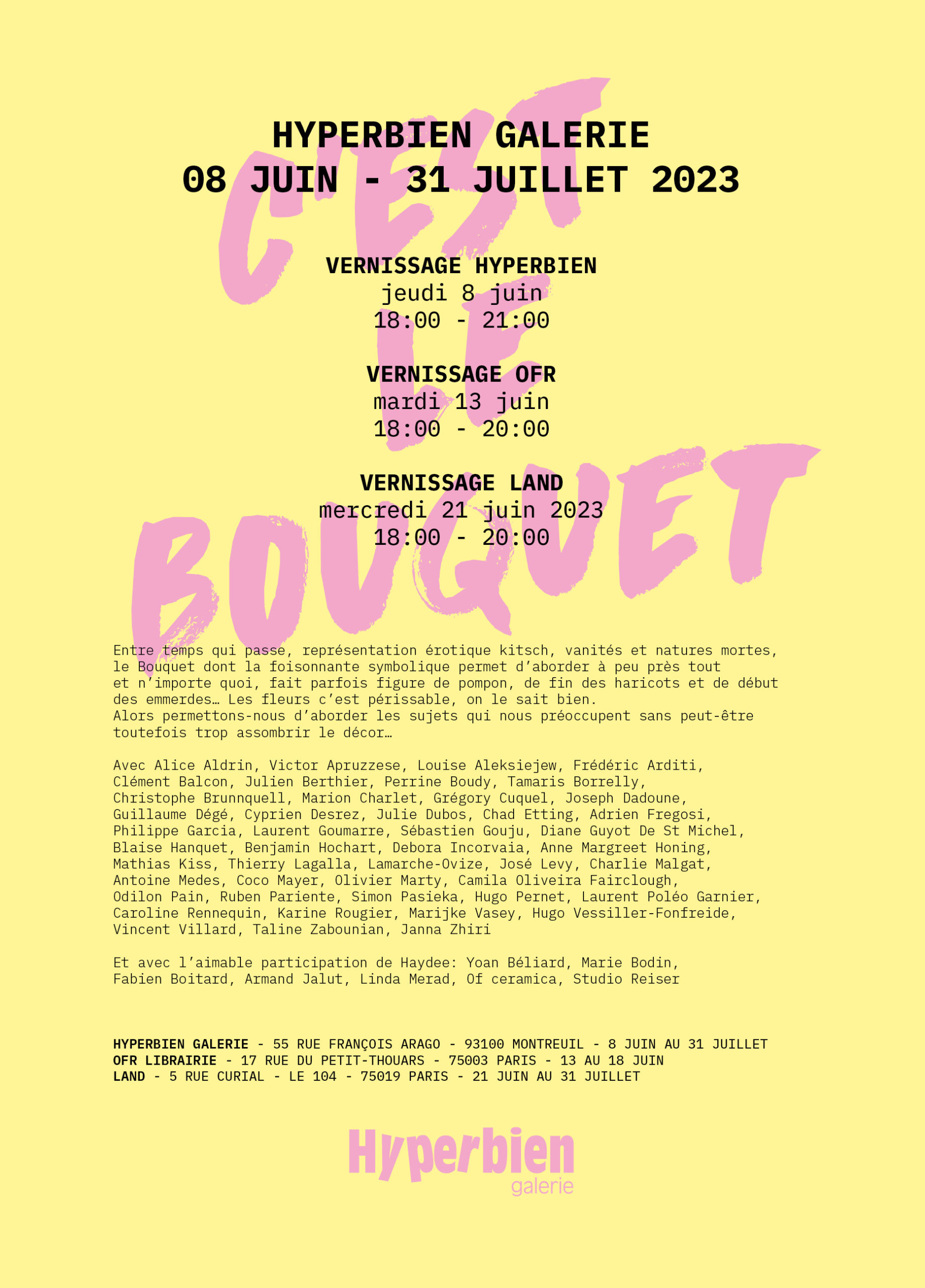 Alice Aldrin-Schrepfer, Victor Apruzzese, Louise Aleksiejew, Frédéric Arditi, Clément Balcon, Julien Berthier, Perrine Boudy, Tamaris Borrelly, Christophe Brunnquell, Marion Charlet, Grégory Cuquel, Joseph Dadoune, Guillaume Dégé, Cyprien Desrez, Julie Dubos, Chad Etting, Adrien Fregosi, Philippe Garcia, Laurent Goumarre, Sébastien Gouju, Sylvain Grundlinger, Diane Guyot De St Michel, Blaise Hanquet, Benjamin Hochart, Debora Incorvaia, Anne Margreet Honing, Mathias Kiss, Thierry Lagalla, Lamarche-Ovize, José Levy, Charlie Malgat, Antoine Medes, Coco Mayer, Olivier Marty, Camila Oliveira Fairclough, Odilon Pain, Ruben Pariente, Simon Pasieka, Hugo Pernet, Laurent Poléo Garnier, Caroline Rennequin, Karine Rougier, Marijke Vasey, Hugo Vessiller-Fonfreide, Vincent Villard, Taline Zabounian, Janna Zhiri